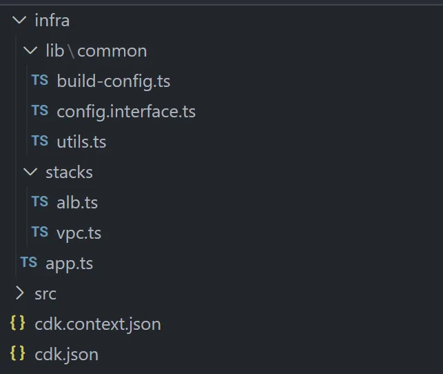 Under infra/lib/common you can find the config and the interface for better typing, it simply will take the variables you specify in cdk.json context and it will create an useful structure. Within infra/app.ts file we declare our stacks in infra/stacks folder. Alright we are all set up, let's clear vpc and alb stacks so we can create our own stacks.