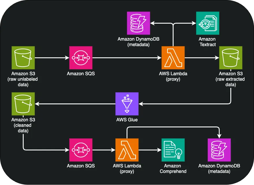 After removing PII, we use Amazon Comprehend to classify the remaining data and understand its context, categorizing documents appropriately. This step helps in organizing data and identifying the type of information each document contains. Since AsyncAssets Finance operates internationally, we need a way to identify the language of documents for metadata enrichment and labeling purposes.